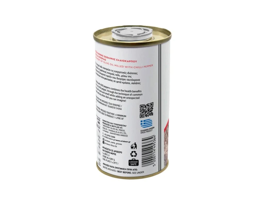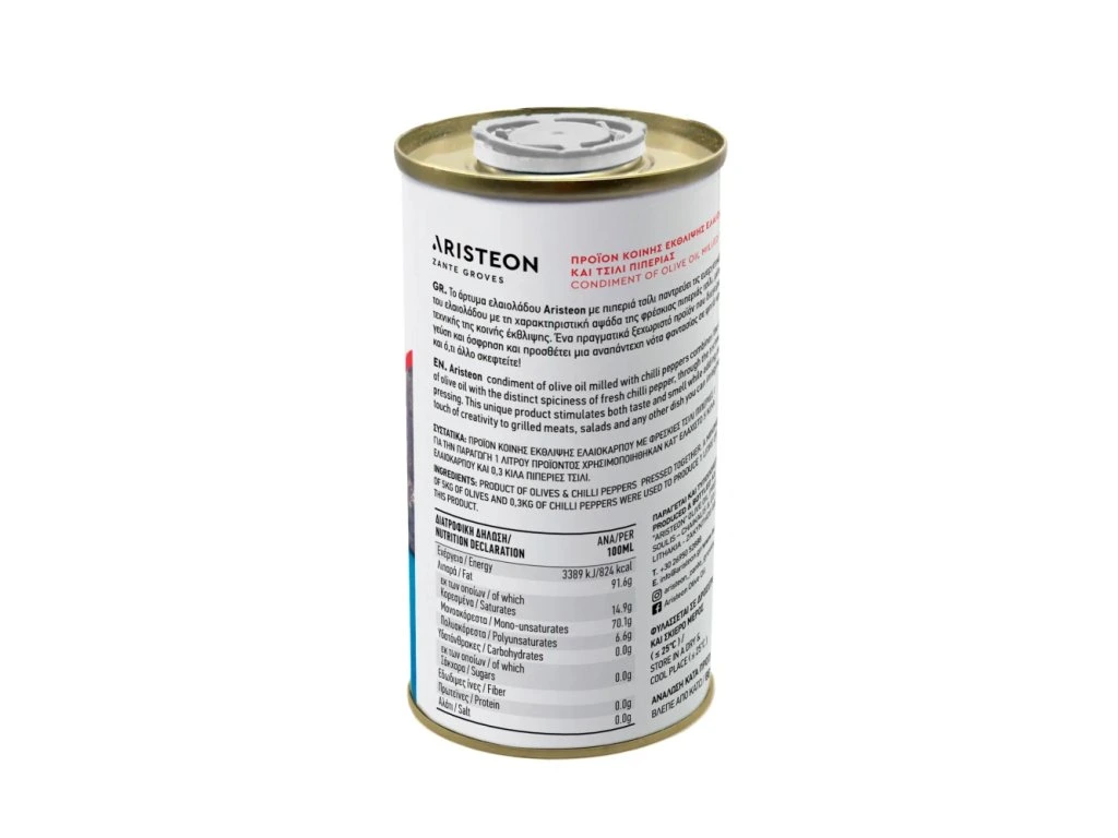 Jemný filtrovaný olivový olej Aristeon lisovaný s čerstvými chilli papričkami. Olej pochází samozřejmě z prvního lisu za studena (do 27°C) a kombinace s chili je přímo rafinovaná. Na počátku přichází klasicky chuť a vůně trávy řeckého ostrova Zakynthos, která je až následně doprovázená pikantností chilli. Pálivost je ale ďábelsky vyvážená, proto olej milují dámy i pánové. Toto spojení je gurmánsky božské! Tipy na servírování? Např. pečivo a sýry, samozřejmě masa všech druhů, těstoviny a rizota, vaječné pokrmy a pikantní saláty.
