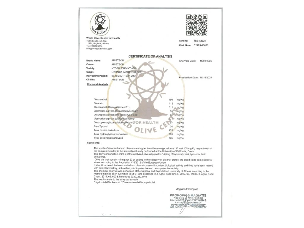 Dopia je ceněná pro kvalitu a vysoký obsah zdraví prospěšných fenolů a jiných látek. Díky nim se olej řadí do kategorie olejů, které chrání krevní tuky před oxidací dle evropské vyhlášky č. 432/2012 a je spojen s protizánětlivými, antioxidačními, kardioprotektivními a neuroprotektivními účinky. Tento diplom uděluje Světové olivové centrum a profesionálně ho zaštiťuje University of Athens. Chemickou analýzu najdete v přiložených souborech.