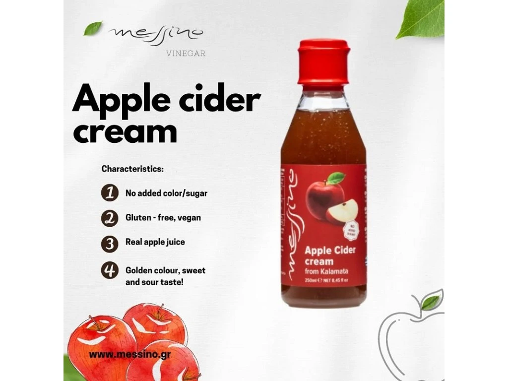 Jablečný ocet je po dlouhou dobu známý svými blahodárnými a antioxidačními vlastnostmi, ale i nezaměnitelnou chutí, která přivedla rodinu Papadeas k vytvoření jablečného krému. Nový příspěvek firmy Messino - Cider cream - obsahuje antioxidanty jablečného octa zároveň s jeho intenzivním aroma. Nová originální glazura z jablečného moštu Messino je založena výhradně na kombinaci lahodného jablečného octa Messino a koncentrované jablečné šťávy bez přídavku balzamikového octa, dochucovadel nebo cukrů.