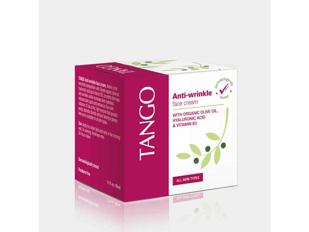Krém na obličej Tango proti vráskám vyniká jemnou konzistencí, svěží parfemací a velmi rychlým vstřebáváním, přičemž nezanechává mastný pocit. Řecký bio olivový olej, kyselina hyaluronová a vitamín B3 vyhlazují jemné linie a vrásky intenzivní hydratací pokožky, potlačují pigmenové skvrny a zvyšují jas kůže. Krém je vhodný pro všechny typy kůže.