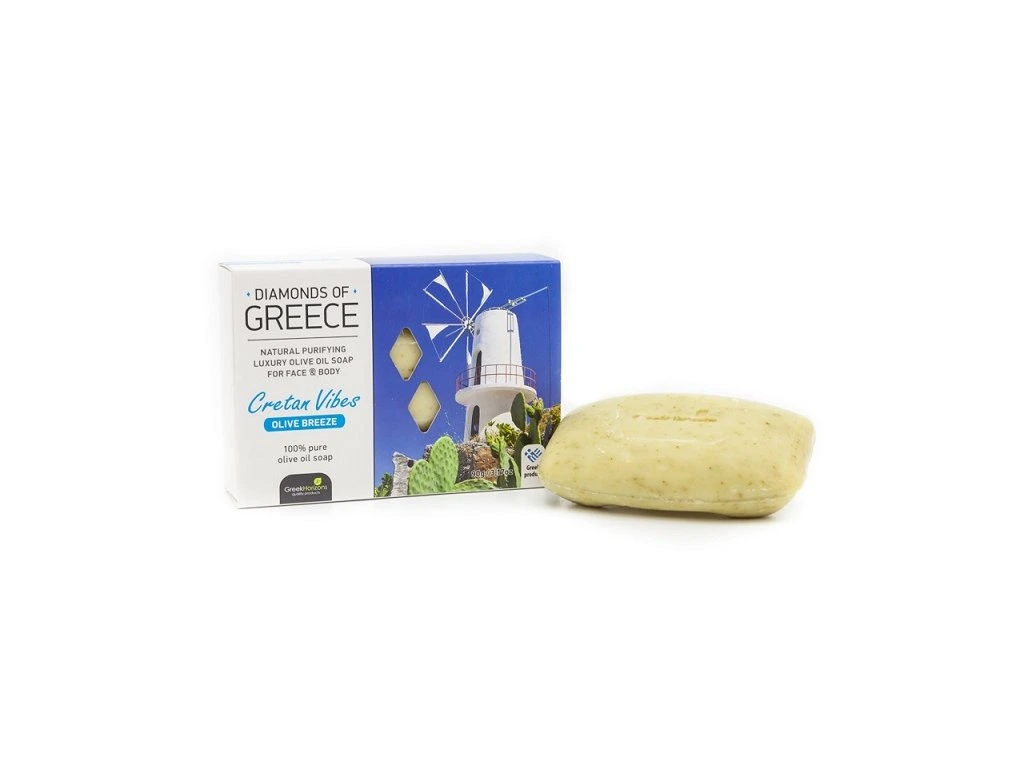 Luxusní 100% přírodní olivové mýdlo řady Diamonds of Greece, které je baleno v designové papírové krabičce a zdobené motivem atraktivní řecké destinace.