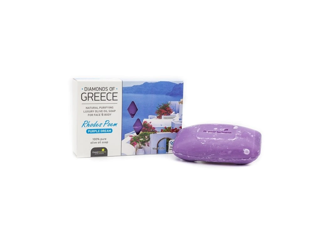 Luxusní 100% přírodní olivové mýdlo řady Diamonds of Greece, které je baleno v designové papírové krabičce a zdobené motivem atraktivní řecké destinace.