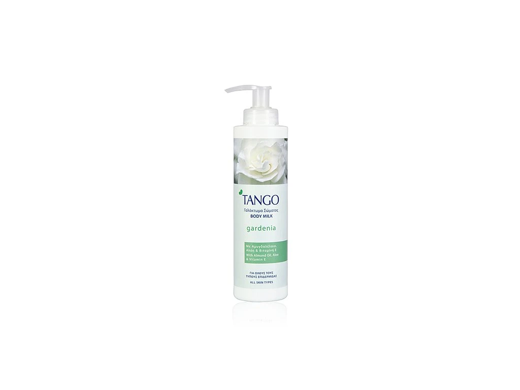 Tělové mléko Tango pro všechny typy pokožky obsahuje mandlový olej, aloe a vitamín E. Vyznačuje se lehkou květovou vůní gardenie a zanechává kůži dlouho hydratovanou a vláčnou s hedvábným efektem. Lehká konzistence zajišťuje rychlé vstřebávání krému do pokožky bez mastného filmu. Příznivé účinky mandlového oleje, šťávy z aloe a vitamínu E utvářejí jedinečný mix, který pečuje o pokožku a je vhodný pro každodenní použití.