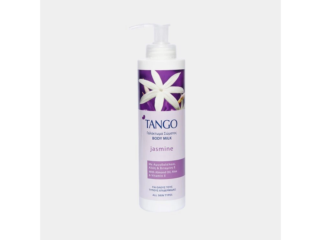Tělové mléko Tango pro všechny typy pokožky obsahuje mandlový olej, aloe a vitamín E. Vyznačuje se atraktivní vůní jasmínu a zanechává kůži dlouho hydratovanou a vláčnou s hedvábným efektem. Lehká konzistence zajišťuje rychlé vstřebávání krému do pokožky bez mastného filmu. Příznivé účinky mandlového oleje, šťávy z aloe a vitamínu E utvářejí jedinečný mix, který pečuje o pokožku a je vhodný pro každodenní použití.