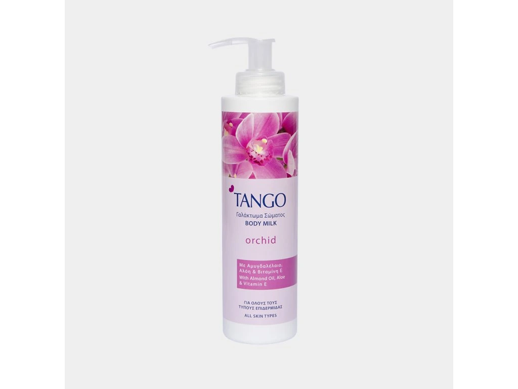 Tělové mléko Tango pro všechny typy pokožky obsahuje mandlový olej, aloe a vitamín E. Vyznačuje se nádhernou vůní orchidejí a zanechává kůži dlouho hydratovanou a vláčnou s hedvábným efektem. Lehká konzistence zajišťuje rychlé vstřebávání krému do pokožky bez mastného filmu. Příznivé účinky mandlového oleje, šťávy z aloe a vitamínu E utvářejí jedinečný mix, který pečuje o pokožku a je vhodný pro každodenní použití.